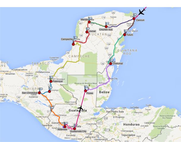 Am frühen Morgen fuhren wir nach Chichicastenango und besuchten einen bunten, gutbesuchten, farbigen Markt. Nach der Besichtigung in Antigua ging es nach Guatemala City. Von dort ging es per Flugzeug nach Flores und besuchten die Mayastätte Tikal im Dschungel. Weiter ging die Fahrt per Bus durch Belize zum Mittagshalt und weiter zurück nach Mexiko und erreichten das Tagesziel Chetumal.